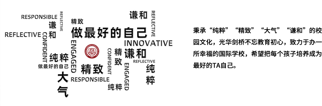 光华剑桥2011年4月创办于上海,是一颗把“做最好的自己”刻进基因的沪上国际教育明珠。办学十四年来,光华剑桥在校长雷冬冬博士的带领下不断发展,办学设施日臻完善、学生活动日益丰富、升学成果愈发亮眼。