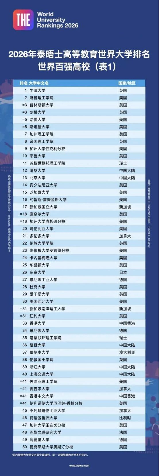 2026泰晤士高等教育世界大学排名重磅发布!中国高校表现亮眼